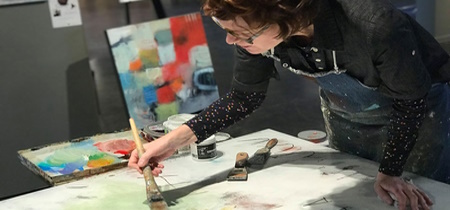 Drawing on her experience as a former illustrator, Christy uses an array of media and a finely honed visual vocabulary to connect with viewers on multiple levels. She plays with line and shape over fields of color in compositions both large and small that invite the viewer to approach, investigate, and discover the surprisingly sophisticated mark-making that is visible only from an intimate distance.