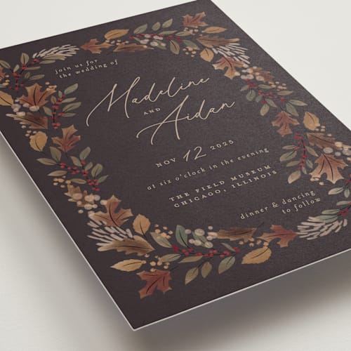 Wedding invitations should be a reflection of your personal style. At Minted, we offer a wide range of fall-inspired invitations in a variety of sizes so that there is something elegant and appealing for everyone. Whether you prefer a more rustic, nature-forward style of invitation or a luxurious gold-foiled formal invitation, there are so many options for fall wedding invitations. Here are a few of the themes you might want to consider: