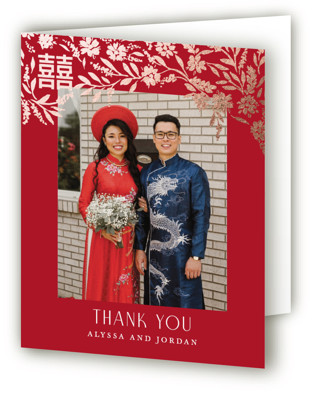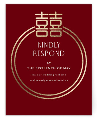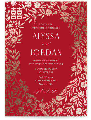 Garden Vines is inspired by gold floral embroidery on Chinese bride’s red dresses, and a “double happiness” symbol is also incorporated into the design.”