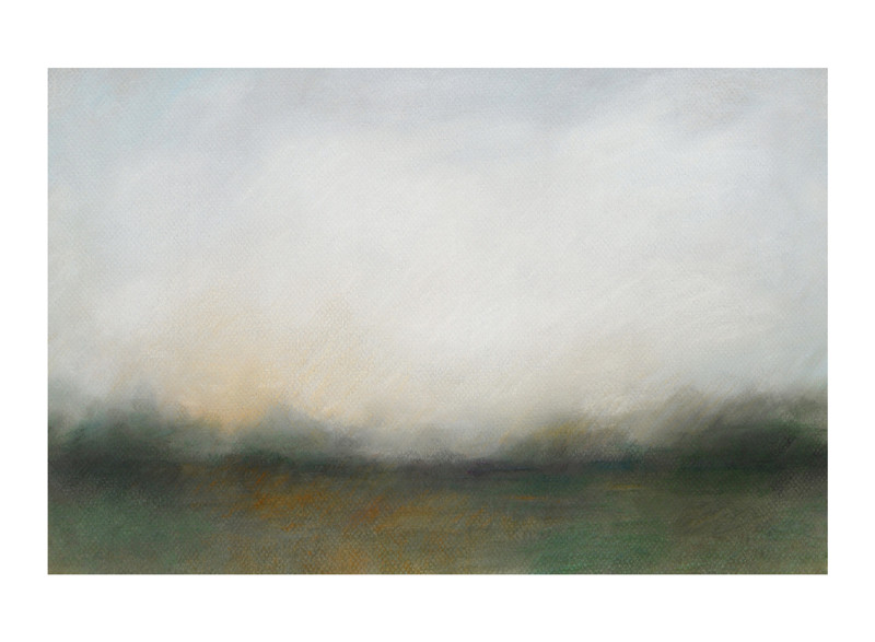This pastel drawing captures the moody, cool shadows of an open field. As the sun sets, hints of gold scatter across the grass. The big, open sky turns a soft gray as the day slowly fades into night. The desaturated colors and soft blending create a sense of calm for the viewer.