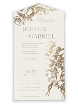Our All-In-One combination offers exquisitely crafted foil-pressed designs for your once-in-a-lifetime occasion along with the savings of bundling your Wedding invitations and RSVP cards. Each chic and elevated invitation makes a beautiful statement designed for the convenience of you and your guests. Simply fold and seal to send the invitation which includes a perforated, addressed RSVP postcard that your guests can fill out and drop in the mail.