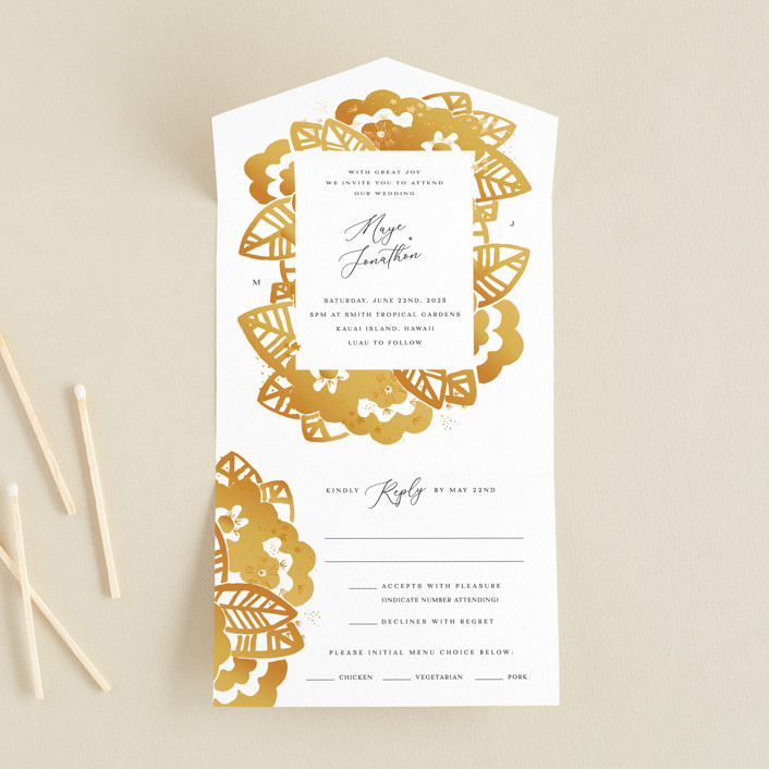 Our All-In-One combination offers exquisitely crafted stationery for your once-in-a-lifetime occasion along with the savings of bundling your Wedding invitations and RSVP cards. Each chic and elevated invitation makes a beautiful statement designed for the convenience of you and your guests. Simply fold and seal to send the invitation which includes a perforated, addressed RSVP postcard that your guests can fill out and drop in the mail.