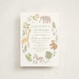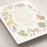 A safari-themed hand-drawn baby shower invitation in the new oval die-cut shape. The baby’s initial is cutely placed in the illustration