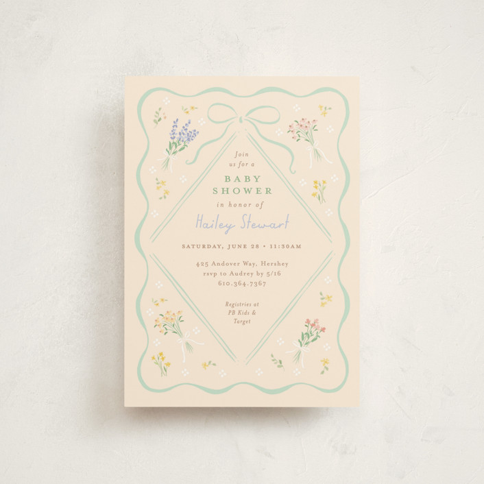 Little floral bouquets tied with string adorn the four corners of this whimsical baby shower invite