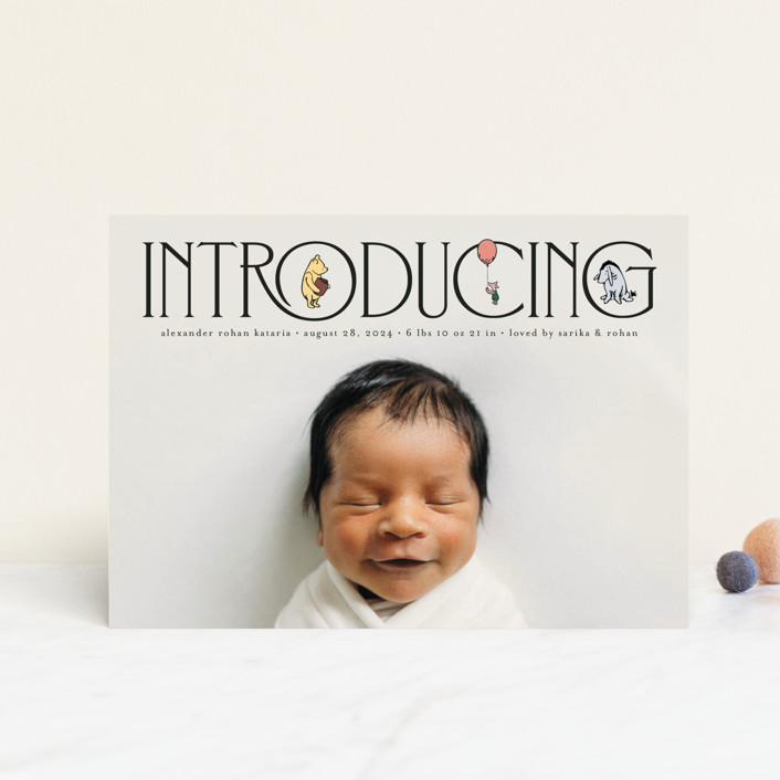 This cute Disney birth announcement features a full bleed photo and modern typography. Illustrations of Winnie the Pooh, Piglet and Eeyore introduce your new arrival and makes the photo the center of the story.