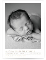 This contemporary birth announcement features a large photograph with the baby's name and information displayed in a minimalist grid.