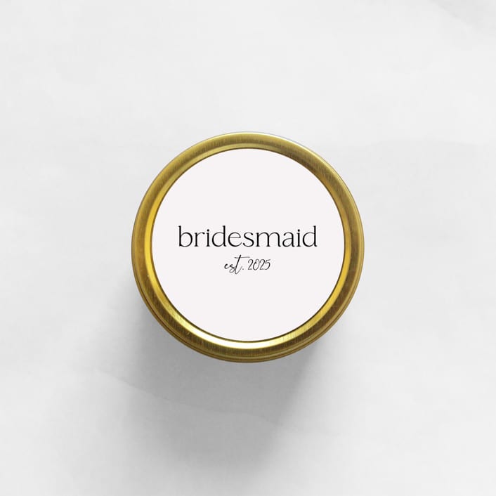 This Bridesmaid est. 2025 label on a gold travel tin soy candle makes a perfect bridesmaid gift.