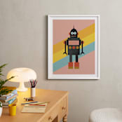 The vintage-inspired robot features fun, retro stripes and playful colors. .