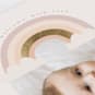 A modern birth announcement with a shimmering gold foil accented rainbow