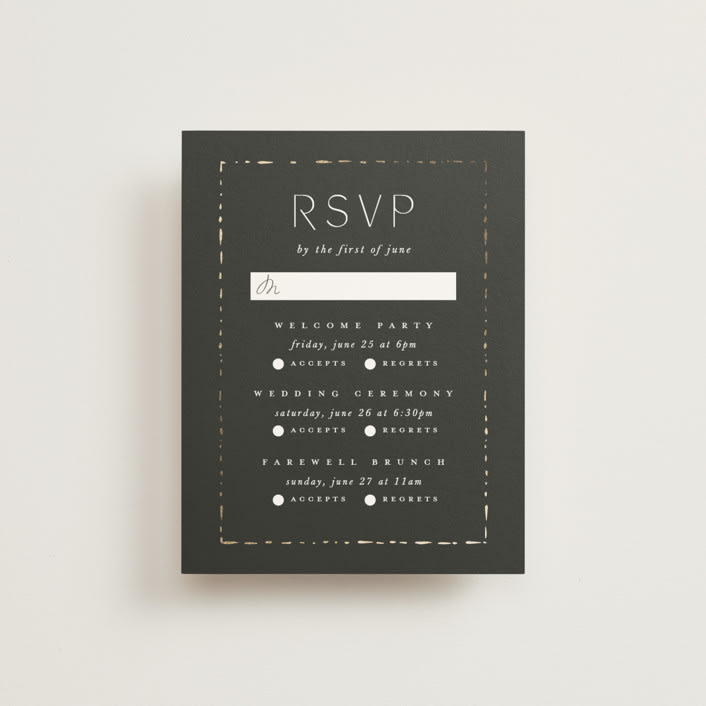 Beautifully request that your guests RSVP to multiple events for your wedding celebration. Designed to coordinate with your wedding invitation suite, these RSVP cards are a perfect accompaniment to your Minted wedding invitation. Tie it all together with a coordinating belly band for a luxe finishing touch. Each insert card is fully customizable and printed on luxe paper.
