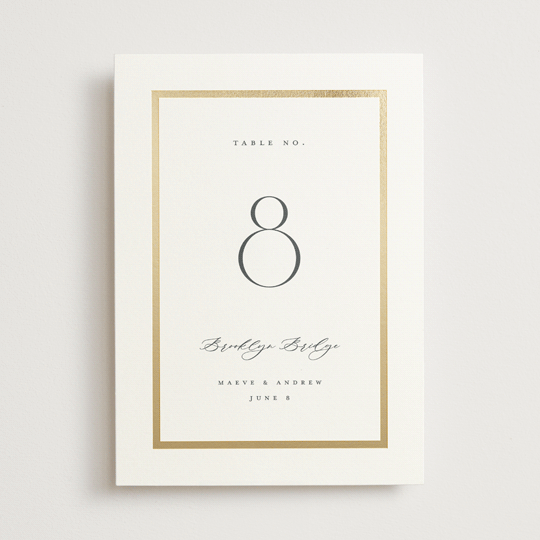 Foil-pressed table numbers enhance the look of your tablescape and put the finishing touch on your special day. All table numbers come with FREE custom text printing of the names or numbers of your tables. Double-sided printing is included in the price; choose to match the front or pick from any of our other text, photo, or pattern backers. Table numbers come in a flat or folded format. If you have any questions or special requests, please email us.