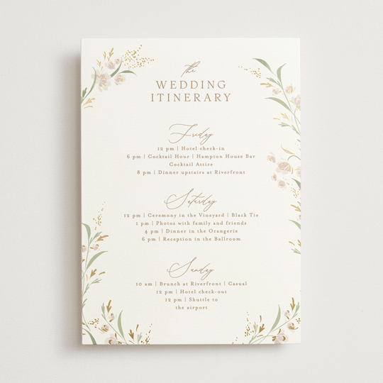 From welcome parties to group activities to send-off brunches, let guests in on all your planned festivities with weekend itinerary cards featuring real, hand-pressed foil. Customize color theme, card shape, paper type, and more to complement your stationery suite, then include in guests’ welcome bags to keep them in the loop.