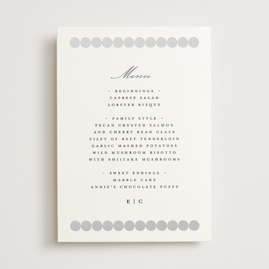 Give your guests a taste of the meal to come with a luxe Gloss-Press® menu, designed by independent artists. Exclusively available at Minted, these designs feature the beauty and subtlety of gloss, debossed on high quality paper. All menus can be customized to match a Minted invitation design. If you have any questions or special requests, please email us.