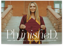 This photo graduation announcement features a play on words announcing that you have finally finished your Ph.D. Degree.