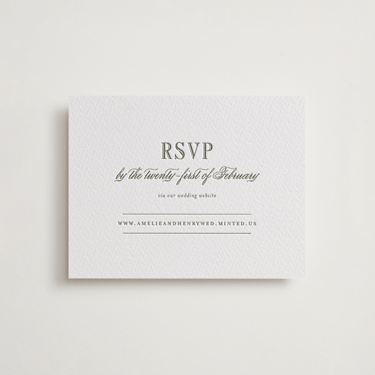 Beautifully request that your guests RSVP to multiple events for your wedding celebration. Designed to coordinate with your wedding invitation suite, these Letterpress RSVP cards are a perfect accompaniment to your Minted wedding invitation. Tie it all together with a coordinating belly band for a luxe finishing touch.