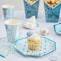 Introducing our captivating Under the Sea Paper Cups, designed to make your shark-themed parties a splash! Dive into a world of oceanic wonder with these stunning blue-colored plates, adorned with mesmerizing silver foil details and an enchanting fish scale print.