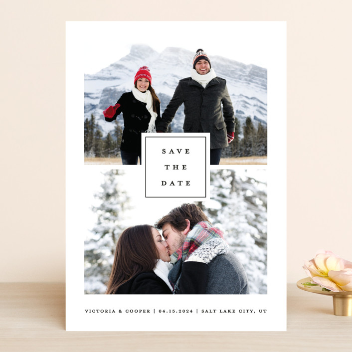 A modern twist on a classic multi-photo save the date with framed inset overlay and simple text.