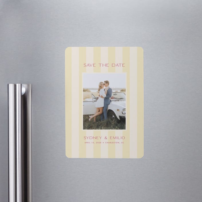 Our most popular Save the Date designs are now available as beautiful, high-quality magnets. Optimized for the highest photo print quality, this stock has a smooth front surface that uses our Smooth Signature Paper—crafted exclusively for Minted by the papermakers at Mohawk. 137 lb., 17.5 point thickness—and a magnetized back. All magnets are designed by our independent community of designers and are fully customizable. If you have any questions or special requests for your magnets, , please email us.