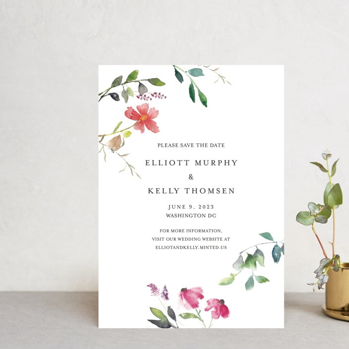 Watercolored wild flowers create an asymmetrical frame on this wedding invitation.