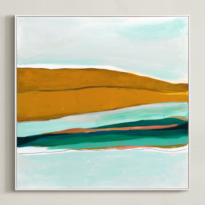 This abstract acrylic painting takes a modern spin on landscape art. The painting was inspired by a family trip to the Alaskan Inside Passage and the amazing glaciers of Glacier Bay. The colors represent beauty of the Alaskan coastline and the geology of the ice sheets.