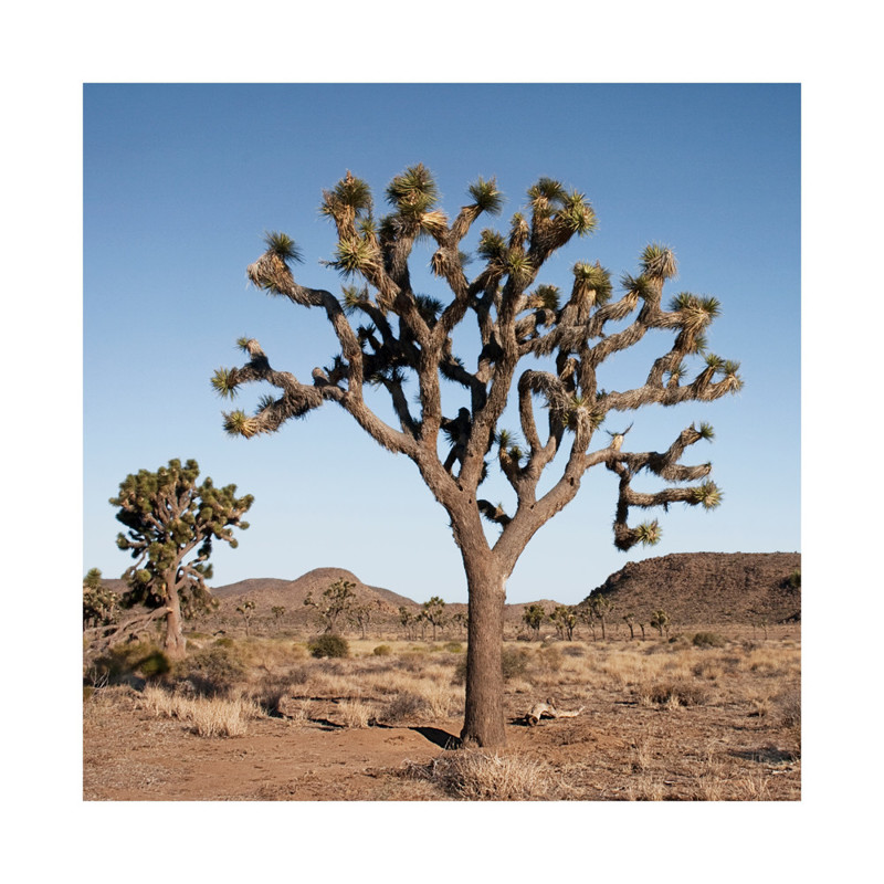 A photograph of a large Joshua Tree in the Mojave Desert under a blue cloudless sky. There are additional Joshua Trees in the background against a horizon of rocky hills in the distance. Yucca brevifolia is another name for the Joshua Tree. It is the largest of the yuccas. They grow two to three inches a year.