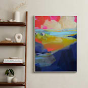 I have a hard time finding exact locations to paint. In this piece, I let my various memories of travel through Maine meld into one image. The coastal islands. The rocky blue shore. The random little barns and cottages. All in brilliant joyful color.