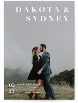 A modern save the date card features couple's names and simple typography.