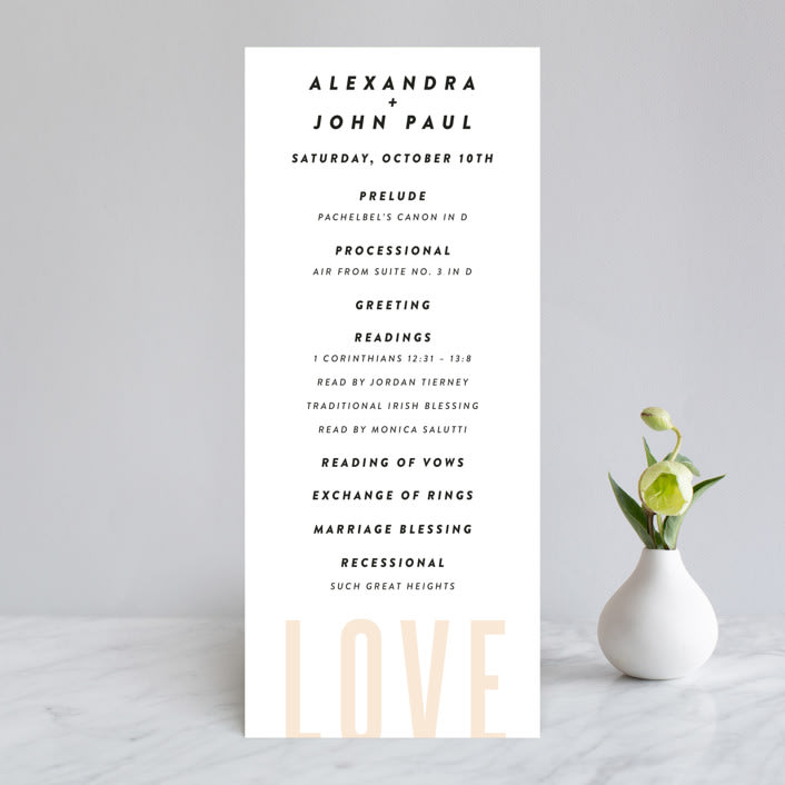 Share the details of your wedding ceremony with a beautiful wedding program printed on luxe paper. All wedding programs can be customized to match any Minted invitation design and printed in the color of your choice. If you have any questions or special requests, please email us.